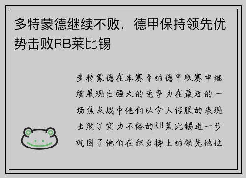 多特蒙德继续不败,德甲保持领先优势击败RB莱比锡